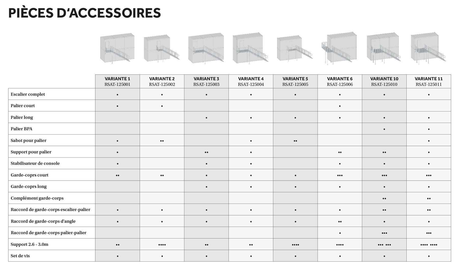 L’aperçu complet de tous les accessoires et composants pour escaliers extérieurs est disponible ici en PDF à télécharger.
