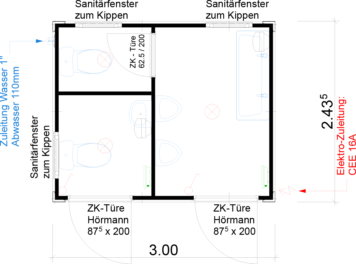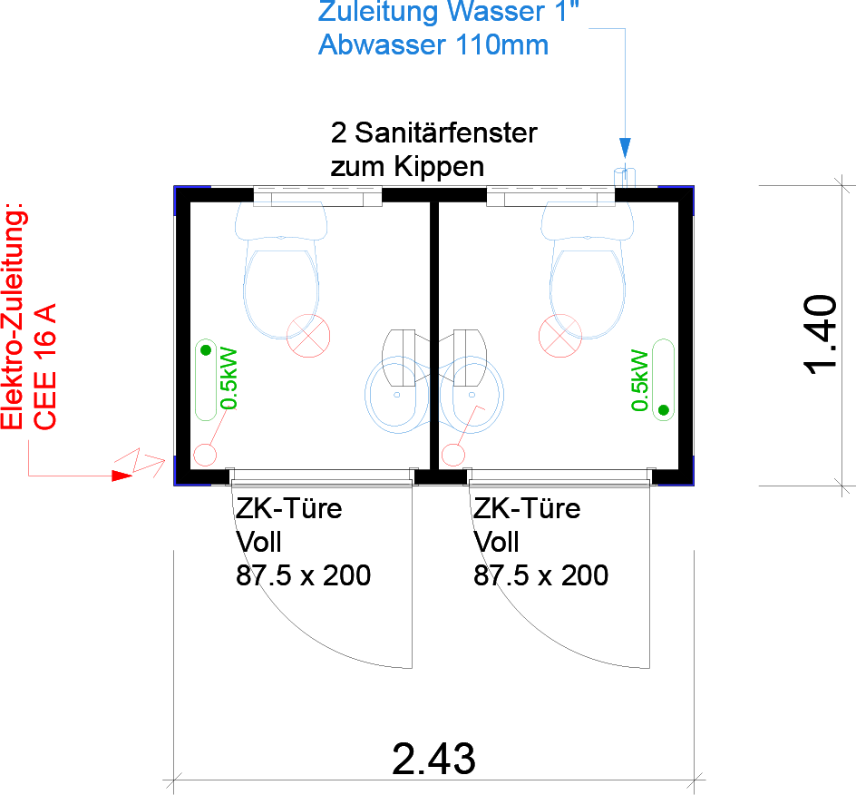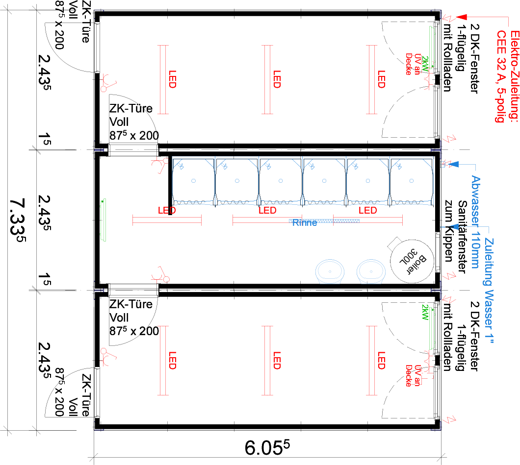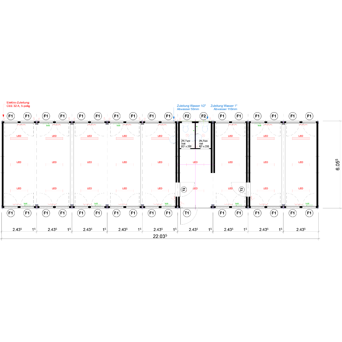 | Ausstattung | 2 Stk. Einzelcontainer 6.05 m x 2.43 m x 2.80 m